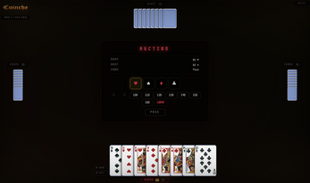 - Auction — pick a suit, choose a bid value, or pass