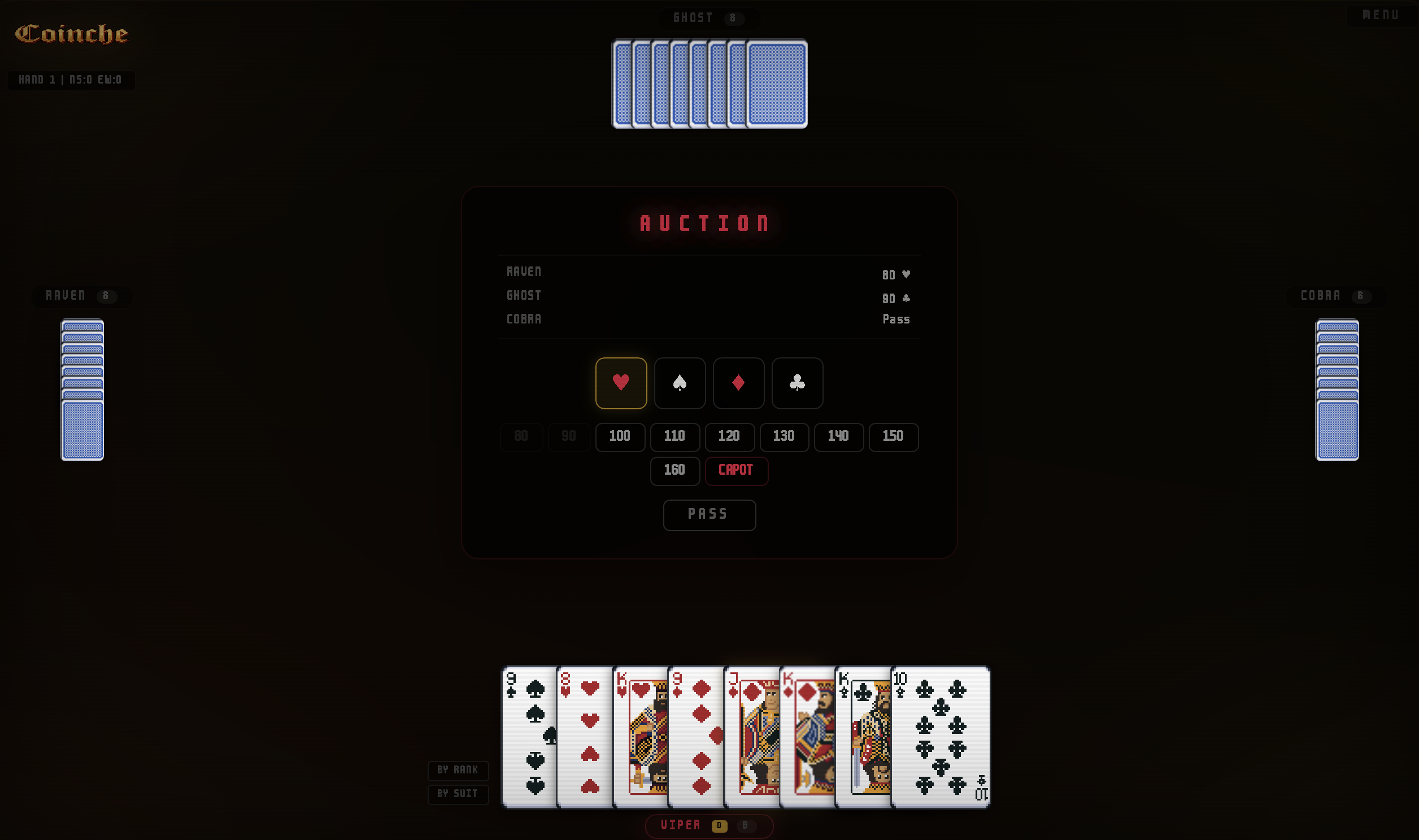 - 4 players, 2 teams — you and your partner (GHOST) vs two AI opponents (RAVEN & COBRA)